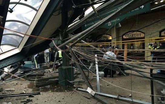 ஹோபோகன் ரயில் நிலையத்தில் வேகமாக வந்த பயணிகள் ரயில், கட்டுப்பாட்டை இழந்து ரயில் நிலையம் மீது பயங்கரமாக மோதி விபத்துக்குள்ளானது.