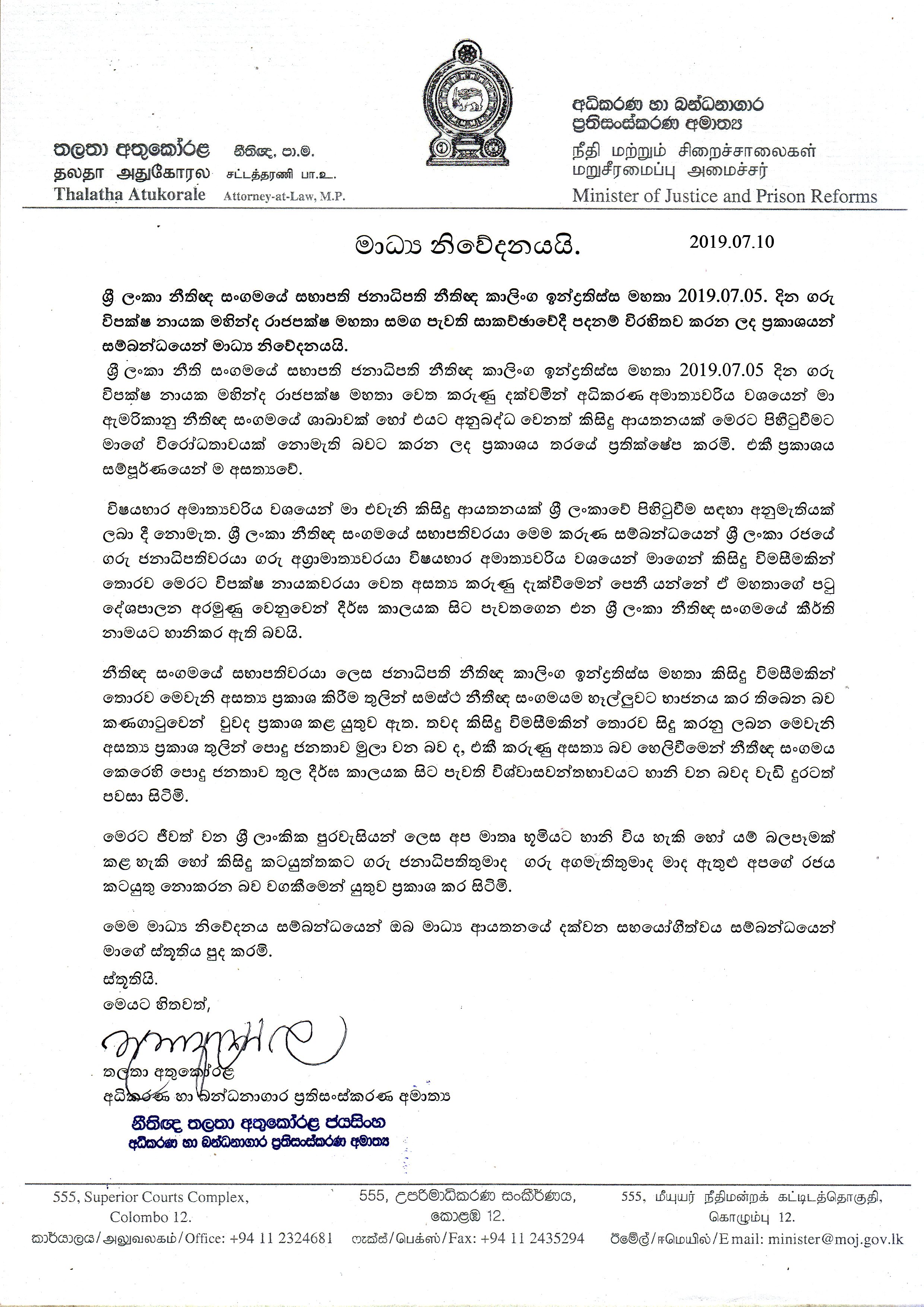 இலங்கை சட்டத்தரணிகள் சங்கத்தின் தலைவர் ஜனாதிபதி சட்டத்தரணி காலிங்க இந்ரதிஸ்ஸ, கடந்த 05ம் திகதி, எதிர்க்கட்சித் தலைவர் மஹிந்த ராஜபக்ஷவை சந்தித்து தம்மை குறித்து வெளியிட்ட கருத்துகளை முழுமையாக நிராகரிப்பதாகவும் அவர் குறிப்பிட்டுள்ளார்.