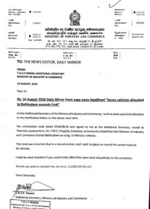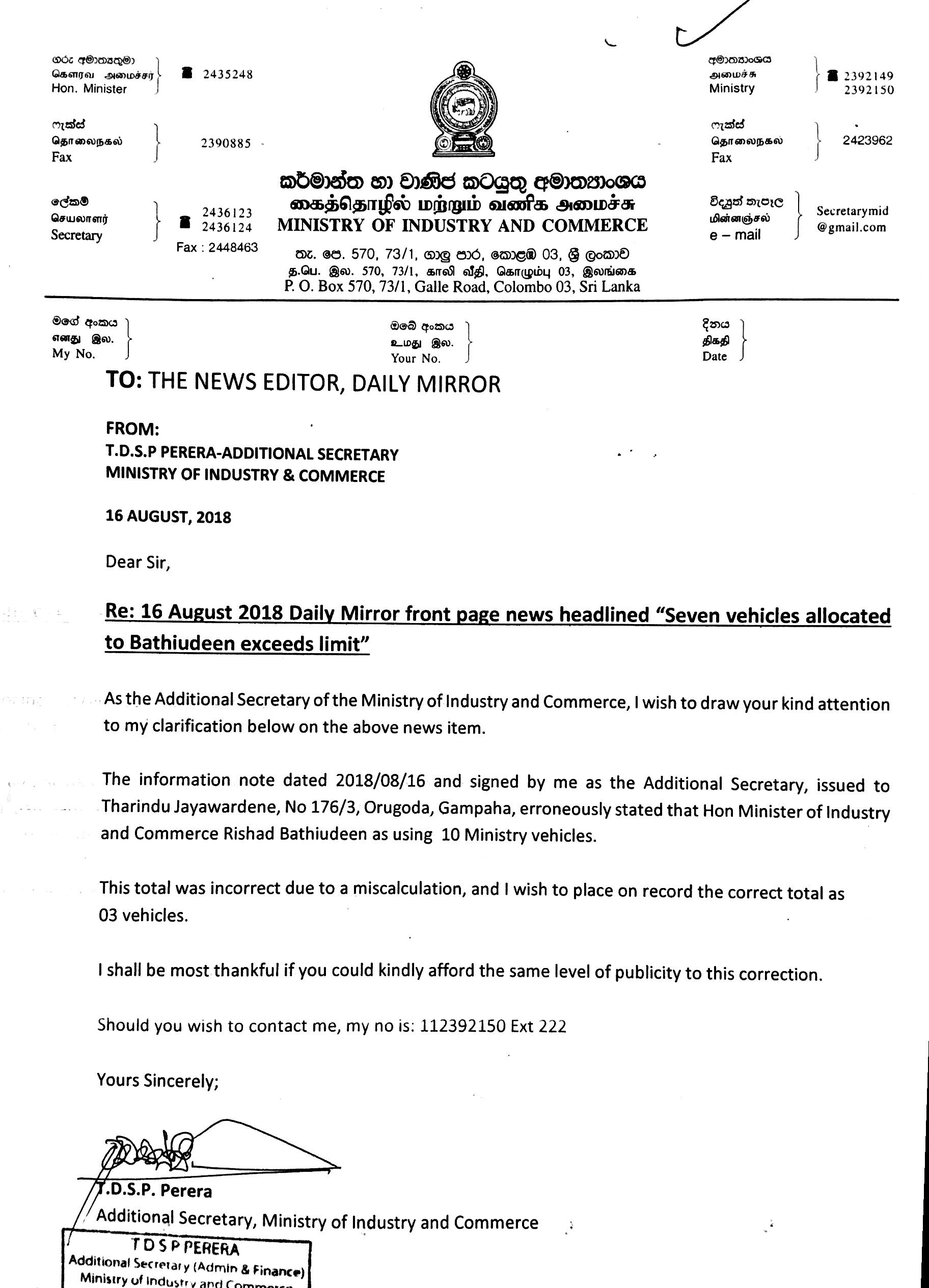 கைத்தொழில் வர்த்தக அமைச்சர் ரிஷாட் பதியுதீனுக்கு ஒதுக்கப்பட்ட வாகனங்கள் தொடர்பில் நேற்று(16) டெய்லி மிரர், லங்கா தீப பத்திரிகைகளில் வெளிவந்த செய்திகள் தொடர்பாக அமைச்சின் மேலதிகச் செயலாளர் T D S P பெரேரா திருத்தமொன்றை வெளியிட்டுள்ளார்.