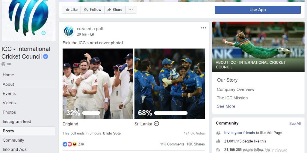 இலங்கை அணியுடன் கூடிய புகைப்படத்தினை சர்வதேச கிரிக்கெட் கவுன்சிலின் உத்தியோகபூர்வ முகநூல் தளத்தின் பிரதான புகைப்படமாக பிரசுரிக்க உங்களது வாக்குகளை வழங்க வாய்ப்புக் கிட்டியுள்ளது.