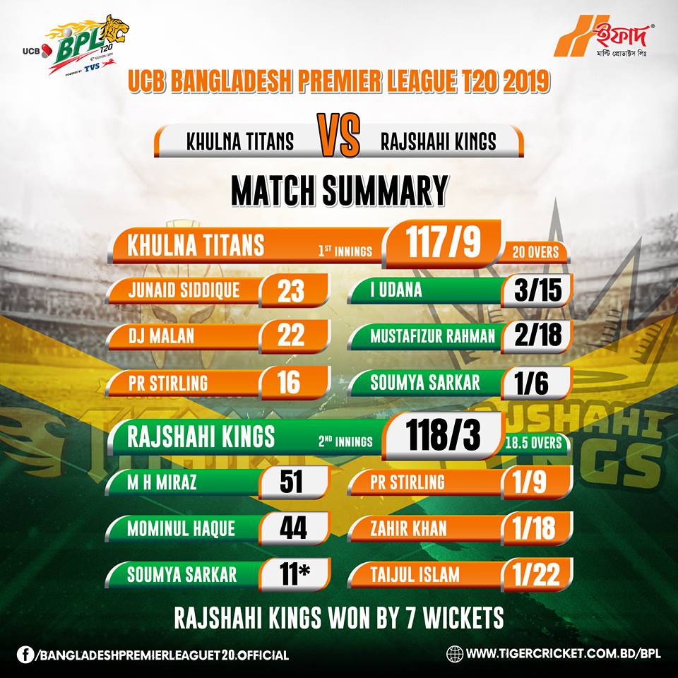 2019 பங்களாதேஷ் பிரீமியர் லீக் தொடரின் நேற்று(09) எட்டாவது போட்டியில் KHULNA TITAS அணியினை வீழ்த்தி, இலங்கை அணியின் இசுறு உதான பிரதிநிதித்துவப்படுத்தும் RAJSHAHI KINGS அணியானது 07 விக்கெட்களுக்கு வெற்றி பெற்றுள்ளது.
