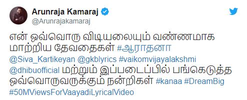 இந்த பாடல் இப்போது யூடியூபில் 50 மில்லியனை தாண்டியிருப்பதும், பலருக்கு பிடித்தமான பாடலாக இருப்பதும் எனக்கு மகிழ்ச்சி அளிக்கிறது. ஆராதனாவின் அழகிய குரல் இந்த பாடலின் இனிமைக்கு முக்கிய காரணமாக அமைந்திருக்கிறது. எல்லாவற்றிற்கும் மேலாக, என்னையும், என் மகள் ஆராதனாவையும் இந்த ஒரே பாடலில் பாடவைக்கும் யோசனையை கொண்டு வந்த அருண்ராஜாவுக்கு நன்றி கடன்பட்டிருக்கிறேன்” என்றார்.