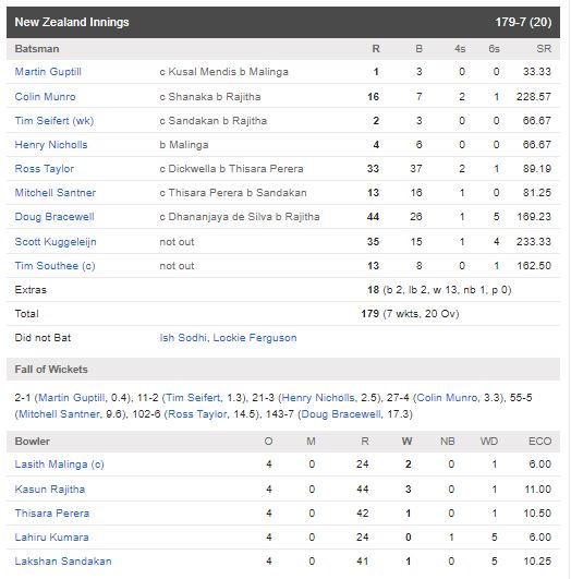 இதன்படி முதலில் துடுப்பாடிய நியூசிலாந்து அணி நிர்ணயிக்கப்பட்ட 20 ஓவர்கள் நிறைவில் 7 விக்கட் இழப்பிற்கு 179 ஓட்டங்களைப் பெற்றுள்ளது.