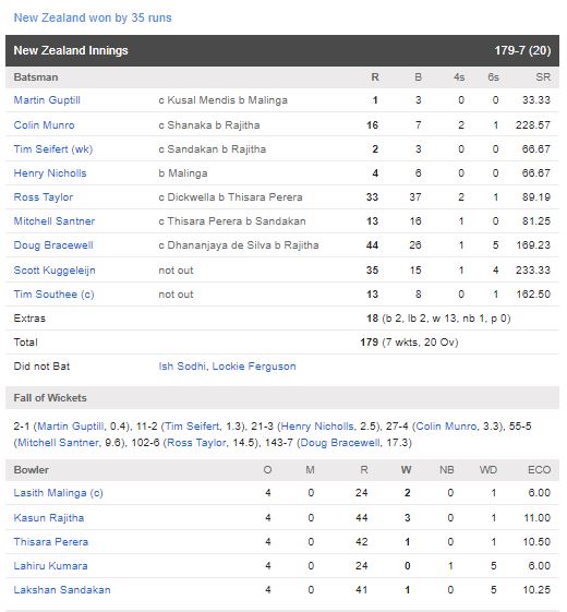 இலங்கை, நியூஸிலாந்து அணிகளுக்கு இடையலான இருபதுக்கு இருபது கிரிக்கட் போட்டியில் நியூஸிலாந்து அணி வெற்றி பெற்றுள்ளது.