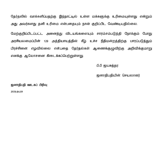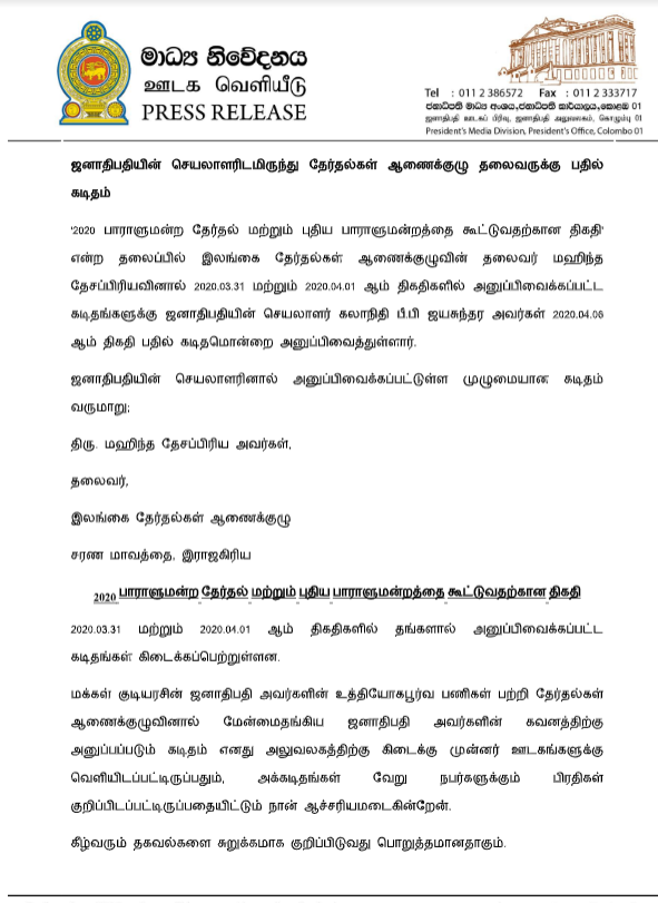 ஜனாதிபதியின் செயலாளரிடமிருந்து தேர்தல்கள் ஆணைக்குழு தலைவருக்கு பதில் கடிதம்