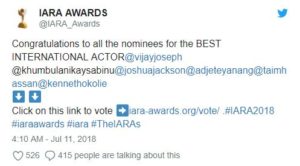 மெர்சல்’ படத்தில் நடித்த நடிகர் விஜய் சிறந்த நடிகர் மற்றும் சிறந்த சர்வதேச நடிகருக்காக ஐஏஆர்ஏ என்ற விருதுக்கு பரிந்துரை செய்யப்பட்டுள்ளார்.