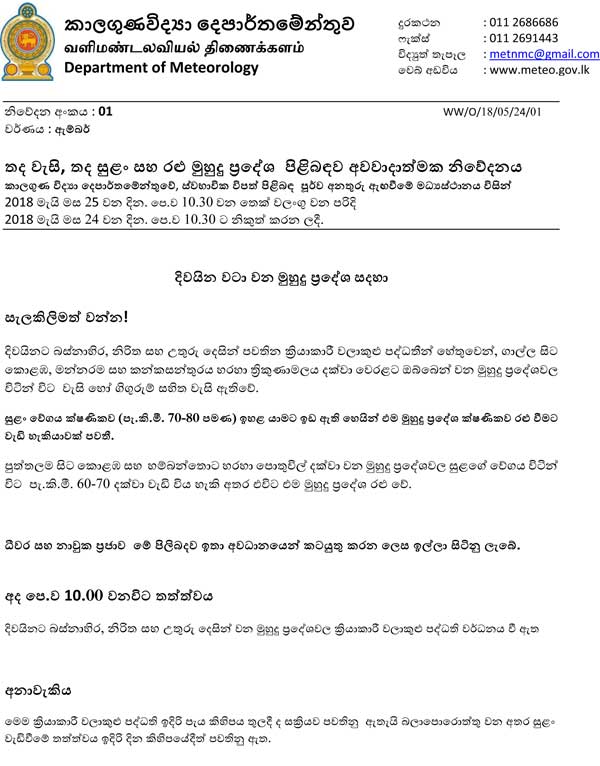 இந்நிலையில், மேல்மாகாணம், சப்ரகமுவ, வடமேல் ஆகிய மாகாணங்களில் 100-150mm வரையான மழைவீழ்ச்சி பதிவாகக்கூடும் எனவும் குறிப்பிடப்பட்டுள்ளது.