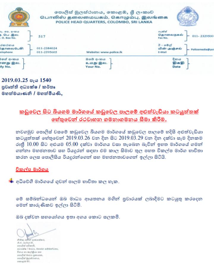 (FASTNEWS | COLOMBO) – கடுவலை பாலத்தின் திருத்தப்பணிகள் காரணமாக கடுவலை – பியகம வீதி மூடப்படவுள்ளதாக தெரிவிக்கப்படுகின்றன.