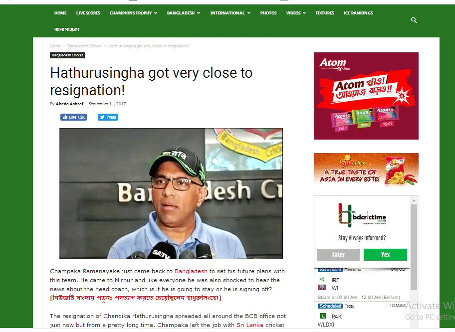 “Hathurusingha got very close to resignation! எனும் தலைப்பில் குறித்த செய்தி பிரசுரிக்கப்பட்டுள்ளது. சம்பிக்க ராமநாயக்க பங்களாதேஷ் அணியின் வேகப்பந்து வீச்சாளராக நியமிக்கப்பட்டதை அடுத்து 2019ம் ஆண்டு தொடக்கம் பங்களாதேஷ் அணியுடன் இருப்பதாக ஹத்துருசிங்க ஒப்பந்தம் செய்யப்பட்டுள்ள நிலையில் இவ்வாறு அவர் பதவி விலக உள்ளதாக குறித்த இணையத்தள செய்தியில் மேலும் குறிப்பிடப்பட்டுள்ளது.