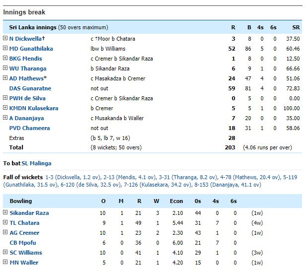 சுற்றுலா சிம்பாப்வே அணி மற்றும் இலங்கை அணிகளுக்கு இடையிலான 5ஆவது சர்வதேச ஒருநாள் போட்டியில் இலங்கை அணி முதலில் துடுப்பெடுத்தாடி 50 ஓவர் நிறைவுக்கு விக்கெட் 8 இனை இழந்து 203 ஓட்டங்களை பெற்றுள்ளது.