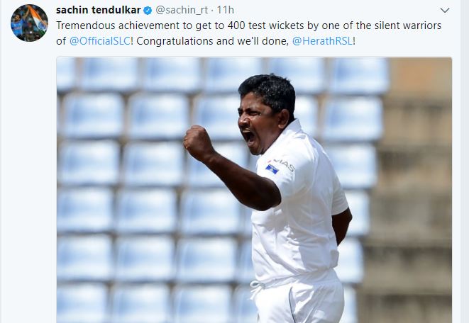 இந்நிலையில் இந்திய அணியின் முன்னாள் வீரர் சச்சின் டெண்டுல்கர் தன்னுடைய டுவிட்டர் பக்கத்தில், 400 விக்கெட்டுகள் வீழ்த்தி இப்படி ஒரு மிகப்பெரிய சாதனை படைத்த ரங்கன ஹேரத்துக்கு வாழ்த்துக்கள் என்றும் வெற்றி பெற்ற இலங்கை அணிக்கும் வாழ்த்துக்கள் எனவும் குறிப்பிட்டுள்ளார்.