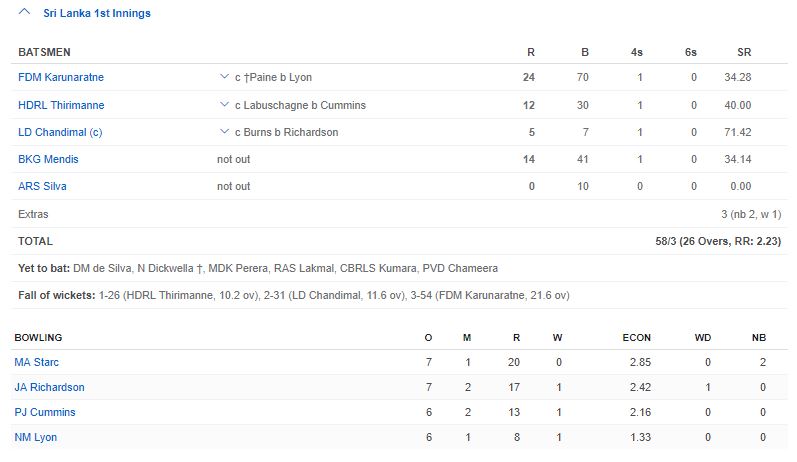 அவுஸ்திரேலிய அணியுடன் இன்று(24) பிரிஸ்பேனில் ஆரம்பமாகிய முதலாவது டெஸ்ட் போட்டியின் (இரவு/பகல்), நாணயற் சுழற்சியில் வெற்றி பெற்று முதலில் துடுப்பெடுத்தாடி வரும் இலங்கை அணியானது தேநீர் இடைவேளை வரையில் 03 விக்கெட்களை இழந்து 58 ஓட்டங்களை பெற்றுள்ளது.
