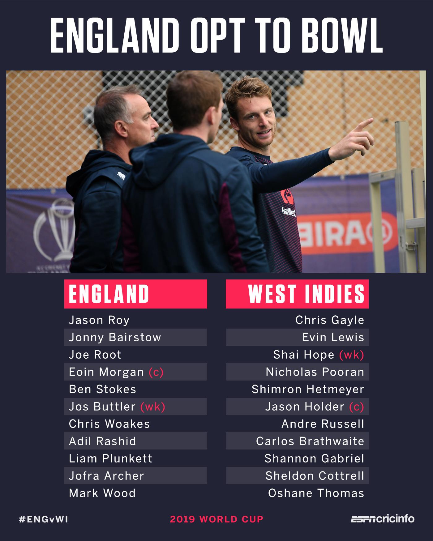 (FASTNEWS|COLOMBO) – உலகக்கிண்ண கிரிக்கெட் தொடரின் 19வது லீக் போட்டியின் மேற்கிந்திய தீவு மற்றும் இங்கிலாந்து அணிகள் இன்று(14) மோதுகின்ற நிலையில், போட்டியின் நாணயற் சுழற்சியில் இங்கிலாந்து அணி வெற்றி பெற்றுள்ளது.