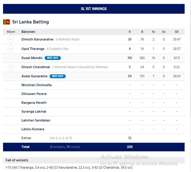 இலங்கை அணி 70 ஓவர் நிறைவில் விக்கெட் 04 இனை இழந்து 220 ஓட்டங்களை பெற்றுள்ளது.