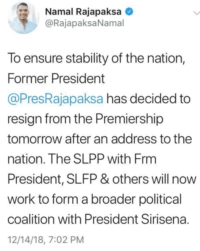 பிரதமர் மஹிந்த ராஜபக்ஸ நாளை(15) தமது பதவியை இராஜினாமா செய்யவுள்ளதாக பாராளுமன்ற உறுப்பினர் நாமல் ராஜபக்ஸ தனது ட்விட்டர் தளத்தில் பதிவிட்டுள்ளார்.