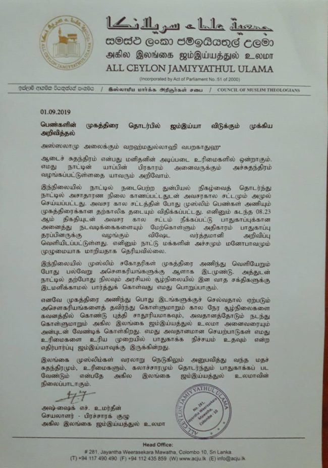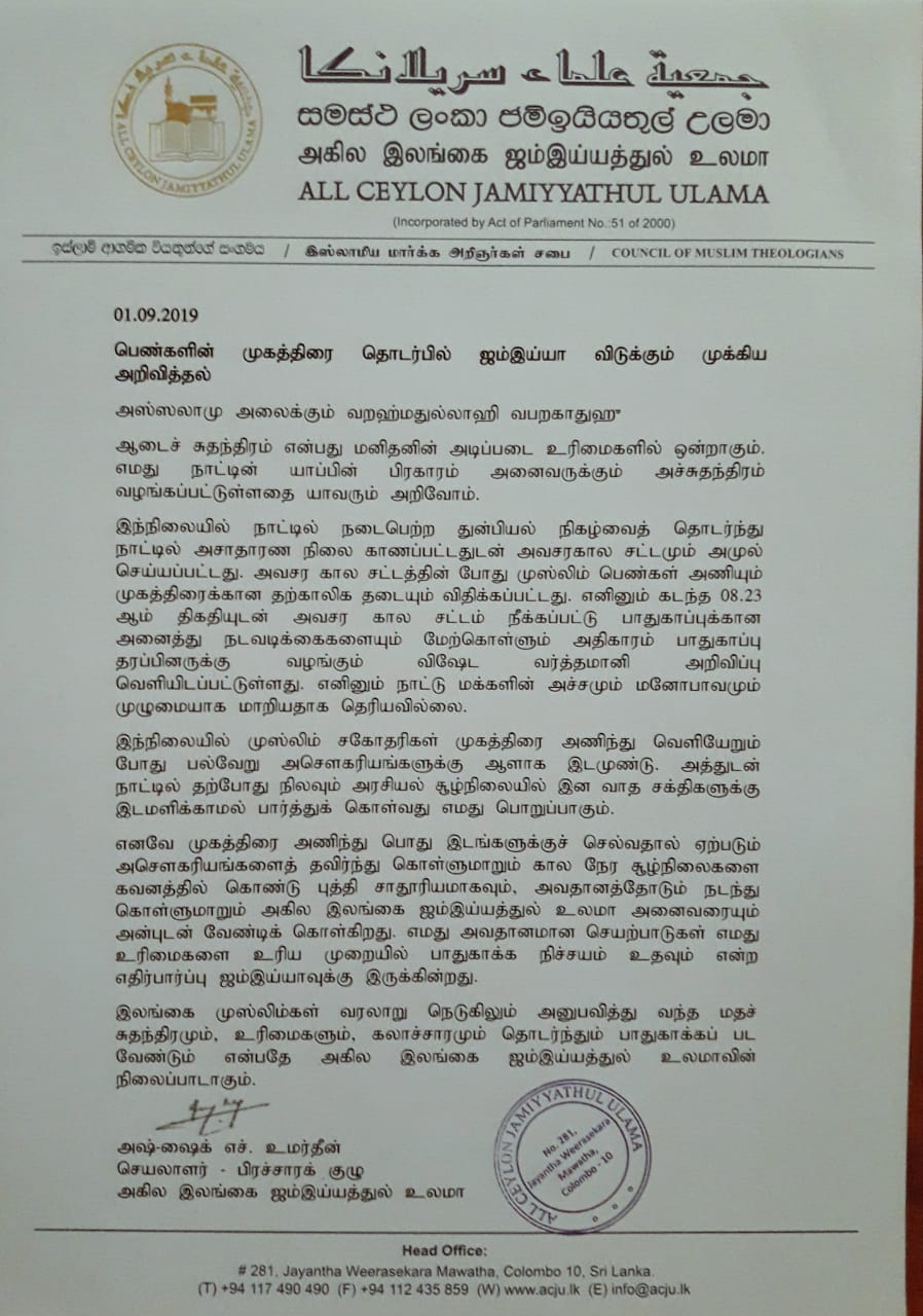இது தொடர்பில் அகில இலங்கை ஜம்மிய்யத்துல் உலமா சபையில் செயலாளர் அஷ்ஷைக் எச்.உமர்தீன் விடுத்துள்ள அறிக்கையில் தெரிவித்துள்ளதாவது, நாட்டில் நாடைபெற்ற துன்பியல் நிகழ்வைத் தொடர்ந்து நாட்டில் அசாதார நிலை காணப்பட்டதுடன், அவசரகால சட்டமும் அமுல் செய்யப்பட்டது. அவசர கால சட்டத்தின்போது முஸ்லிம் பெண்கள் அணியும் முகத்திரைக்கான தற்காலிக தடையும் விதிக்கப்பட்டது.