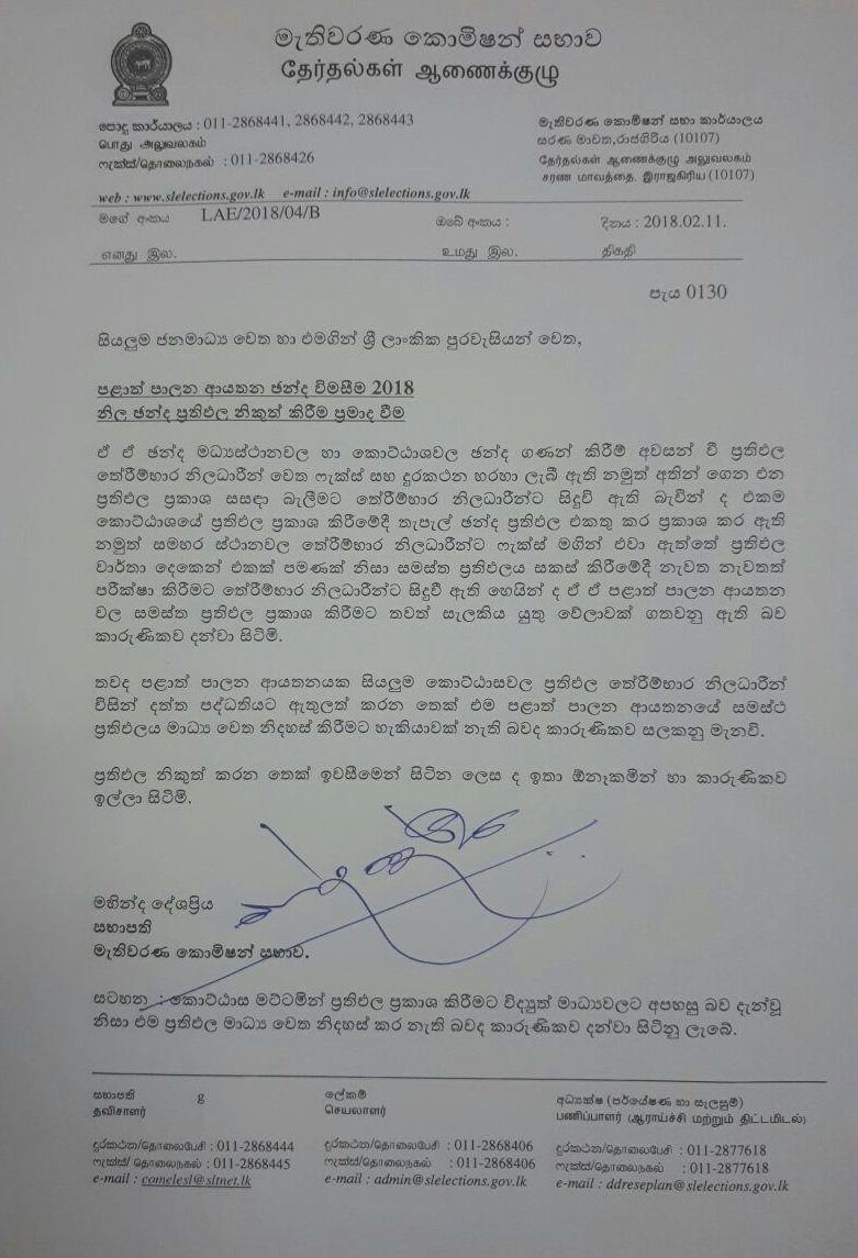 மேலும் உள்ளூராட்சி மன்றங்கள் அனைத்து வட்டார பெறுபேறுகளை தெரிவத்தாட்சி அதிகாரியினால் தரவுக்கட்டமைப்பிற்குள் சேர்க்கும் வரையில் அந்த உள்ளூராட்சி மன்றத்தின் மொத்த பெறுபேறையும் ஊடகத்திற்கு அறிவிப்பதற்குரிய சூழ்நிலை இல்லை என்பதை தயவுடன் கவனத்தில் கொள்ளவும்.