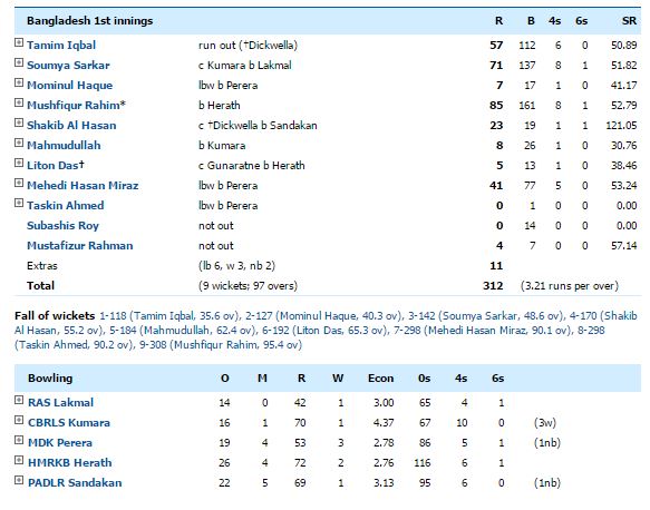 இலங்கை மற்றும் பங்களாதேஷ் அணிகளுக்கிடையேயான முதலாவது டெஸ்ட் கிரிக்கெட் போட்டி நடைபெற்று வருகின்ற நிலையில் தேநீர் நேர இடைவேளையின் போது பங்களாதேஷ் அணியின் புள்ளி விவரம்…