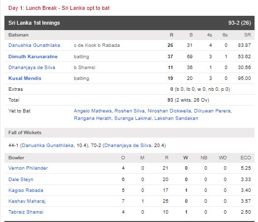 இலங்கைக்கு சுற்றுப்பயணம் மேற்கொண்டுள்ள தென்னாபிரிக்கா அணியுடனான முதலாவது டெஸ்ட் போட்டியானது காலி சர்வதேச கிரிக்கெட் மைதானத்தில் இன்று(12) இடம்பெற்று வருகின்ற நிலையில், மதிய போசன இடைவேளை வரையில் முதலில் துடுப்பெடுத்தாடி வரும் இலங்கை அணியானது 02 விக்கெட்களை இழந்து 93 ஓட்டங்களை பெற்றுள்ளது.