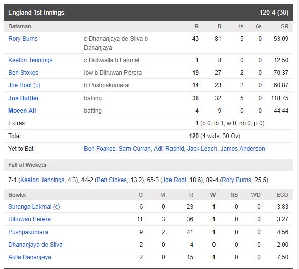 இலங்கை மற்றும் இங்கிலாந்து அணிகளுக்கு இடையிலான இரண்டாவது டெஸ்ட் கிரிக்கட் போட்டி இன்று(14) கண்டி பல்லேகல மைதானத்தில் இடம்பெற்று வரும் நிலையில், முதல் இன்னிங்சில் துடுப்பெடுத்தாடும் சுற்றுலா இங்கிலாந்து அணியானது முதல் நாள் மதிய போசன இடைவெளை வரையில் 04 விக்கெட்களை இழந்து 120 ஓட்டங்களை பெற்றுள்ளது.