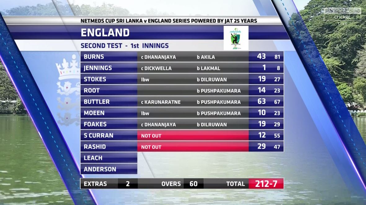இலங்கை அணியுடன் பல்லேகல சர்வதேச மைதானத்தில் இன்று(14) இடம்பெற்ற இரண்டாவது டெஸ்ட் போட்டியின் முதல் நாளில் தேநீர் இடைவெளி வரையில் முதல் இன்னிங்சில் துடுப்பெடுத்தாடி வரும் சுற்றுலா இங்கிலாந்து அணியானது 07 விக்கெட்களை இழந்து 212 ஓட்டங்களை பெற்றுள்ளது.