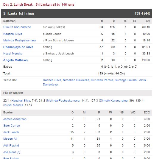 சுற்றுலா இங்கிலாந்து அணி மற்றும் இலங்கை அணிகளுக்கு இடையே பல்லேகல சர்வதேச மைதானத்தில் இடம்பெறும் இரண்டாவது டெஸ்ட் போட்டியின் இரண்டாவது நாளின் மதிய போசன இடைவெளி வரைக்கும், தனது முதல் இன்னிங்சில் துடுப்பெடுத்தாடி வரும் இலங்கை அணியானது 04 விக்கெட்களை இழந்து 139 ஓட்டங்களை பெற்றுள்ளது.