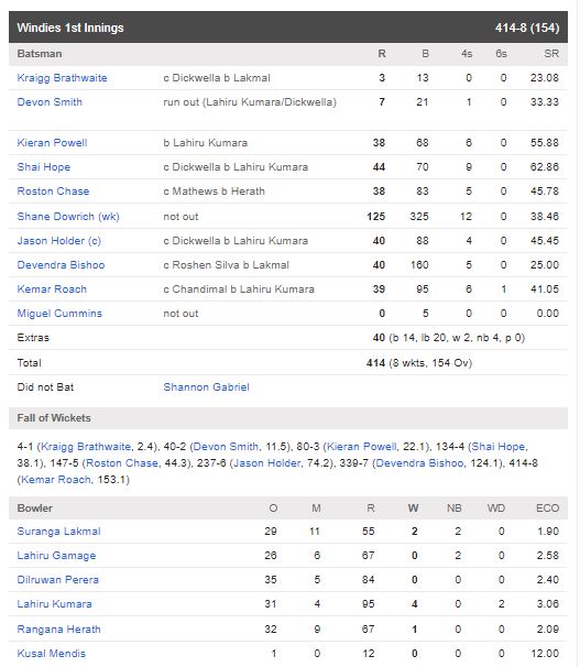 மேற்கிந்திய தீவுகள் அணி சார்பாக ஷேன் டாவ்ரிச் ஆட்டமிழக்காமல் 125 ஓட்டங்களை பெற்றுள்ளார். இலங்கை அணி சார்பில் லஹிரு குமார 04 விக்கட்டுகளை வீழ்த்தினார்.