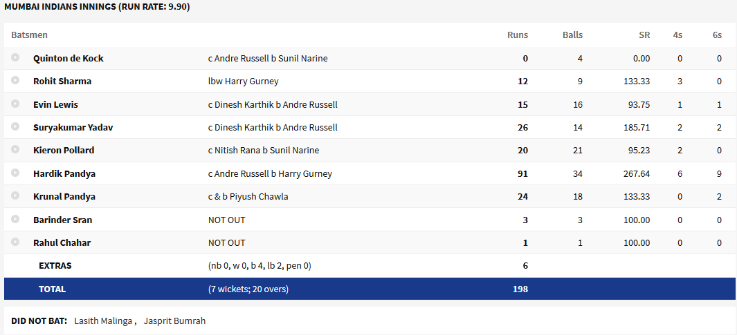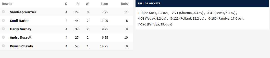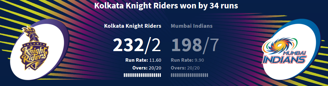 (FASTNEWS | COLOMBO) – இந்தியன் பிரிமியர் லீக் தொடரின் நேற்று(28) இடம்பெற்ற 47வது போட்டியில் மும்பை இந்தியன்ஸ் அணியை எதிர் கொண்ட கொல்கத்தா நைட்ரைடர்ஸ் அணி 34 ஓட்டங்களால் வெற்றி பெற்றது.