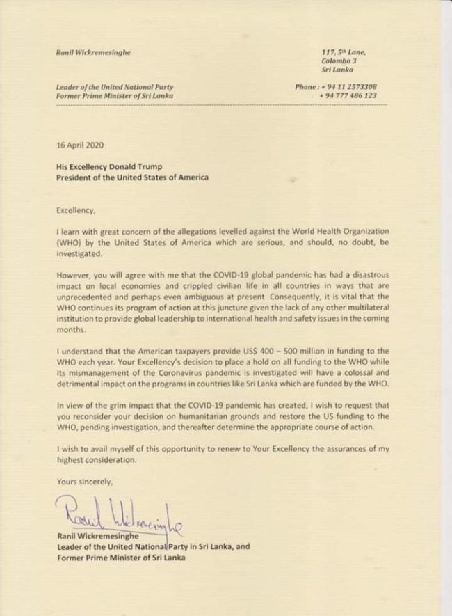 (ஃபாஸ்ட் நியூஸ் | கொழும்பு) – உலக சுகாதார நிறுவனத்துக்கு அளித்து வரப்படும் நிதியை தொடர்ந்தும் வழங்குமாறு அமெரிக்க அதிபர் டொனால்ட் டிரம்ப் இற்கு முன்னாள் பிரதமர் ரணில் விக்கிரமசிங்க கடிதம் மூலம் கோரிக்கை விடுத்துள்ளார்.