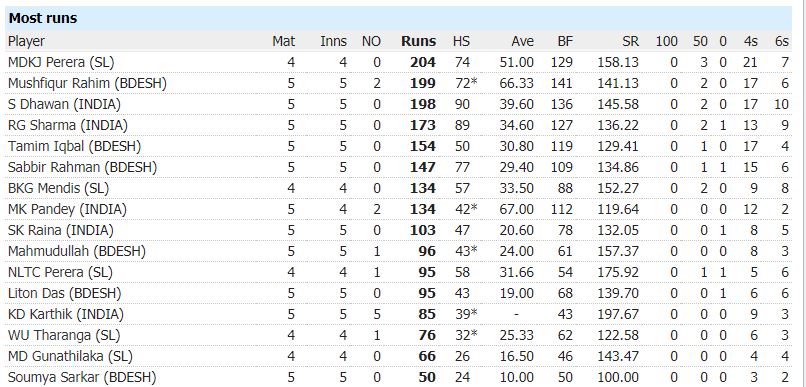எவ்வாராயினும், இறுதிப் போட்டிக்கு இலங்கை அணி உள்வாங்கப்படாத போதிலும், நெடுங்காலத்திற்கு பின்னர் மைதானத்தில் தடம்பதித்த இலங்கை வீரரான குசல் ஜனித் பெரேரா போட்டிகளில் அதிகூடிய ஓட்டங்களைப் பெற்ற வீரராக தரப்படுத்தலில் முன்னிலையில் உள்ளார்.