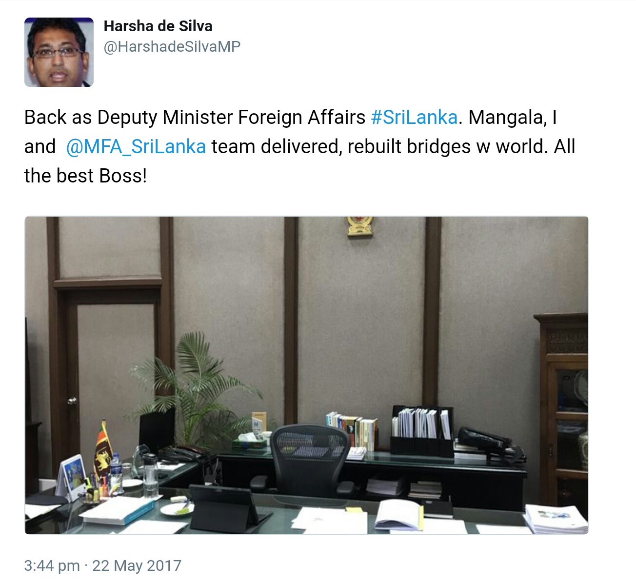 மேலும், “நான், அமைச்சர் மங்கள சமரவீர மற்றும் வெளிவிவகார அமைச்சின் குழுவினர் ஆகியோர் இணைந்து சர்வதேச ரீதியில் உறவுப் பாலத்தைக் கட்டியெழுப்பியுள்ளோம்” என்றும் ஹர்ஷ டி சில்வா குறிப்பிட்டுள்ளார்.