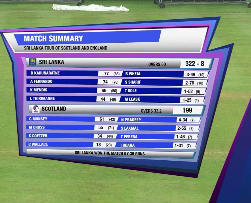 (FASTNEWS|COLOMBO)- இலங்கை மற்றும் ஸ்கொட்லாந்து அணிகளுக்கிடையே நேற்று(21) நடைபெற்ற இரண்டாவது ஒருநாள் சர்வதேச கிரிக்கெட் போட்டியில், இலங்கை அணி டக்வோர்த் லூயிஸ் முறைப்படி 35 ஓட்டங்களால் வெற்றி பெற்றது.