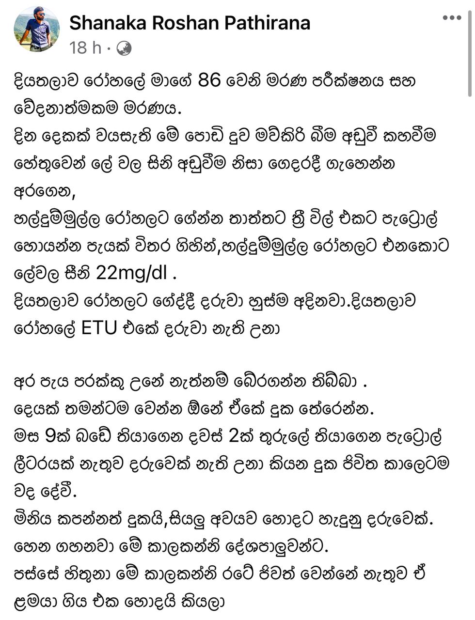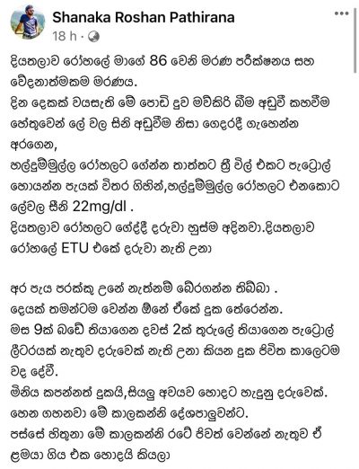 எனினும் இரத்தத்தில் சீனியின் அளவு கடுமையாக குறைவடைந்த காரணத்தினால் குழந்தை இறந்துவிட்டது. நாட்டில் ஏற்பட்டுள்ள எரிபொருள் தட்டுப்பாடு காரணமாக ஆட்டோ ஒன்றைத் தேடிக் கொள்வதில் தாமதம் ஏற்பட்டுள்ளது.