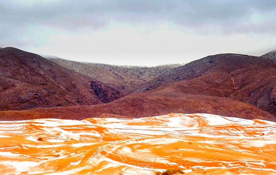 சகாரா பாலைவனத்தின் பல பகுதிகள் பனியினால் மூடப்பட்டுள்ளதாகவும் இதன் காரணமாக சகாரா பாலைவனத்தின் எல்ஜீரியாவுக்கு அருகில் உள்ள பகுதி வெள்ளை நிறமாக காட்சியளிப்பதாகவும் தெரிவிக்கப்படுகின்றது.