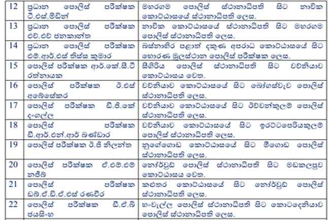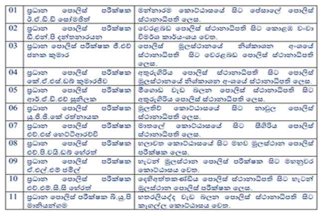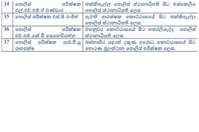 அதன்படி, 14 பிரதான பொலிஸ் பரிசோதகர்களுக்கும், 23 பொலிஸ் பரிசோதகர்களுக்கும் இவ்வாறு இடமாற்றம் வழங்கப்பட்டுள்ளதாக தெரிவிக்கப்படுகின்றன.
