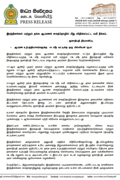 (ஃபாஸ்ட் நியூஸ் | கொழும்பு) – இரத்தினக்கல் மற்றும் தங்காபரண கைத்தொழிலாளர்கள் ஈட்டும் இலாபத்தின் மீது விதிக்கப்பட்டிருந்த 14 வீத வருமான வரி மற்றும் தங்க இறக்குமதிக்கான 15 வீத வரியை நீக்குவதற்கு  ஜனாதிபதி தீர்மானித்துள்ளதாக ஜனாதிபதி ஊடகப்பிரிவு தெரிவித்துள்ளது.