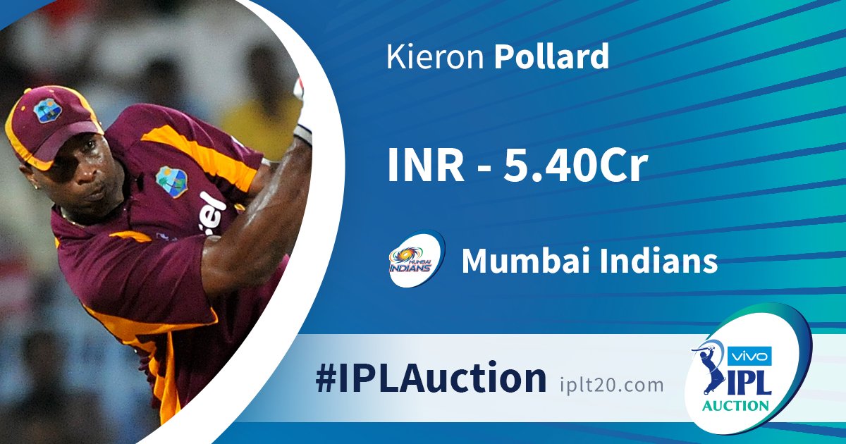 03. மேற்கிந்திய தீவுகள் அணி வீரர் Kieron pollard மும்பை இந்தியன்ஸ் அணிக்கு இந்திய ரூபாவில் 5.40 கோடிக்கு ஏலம்